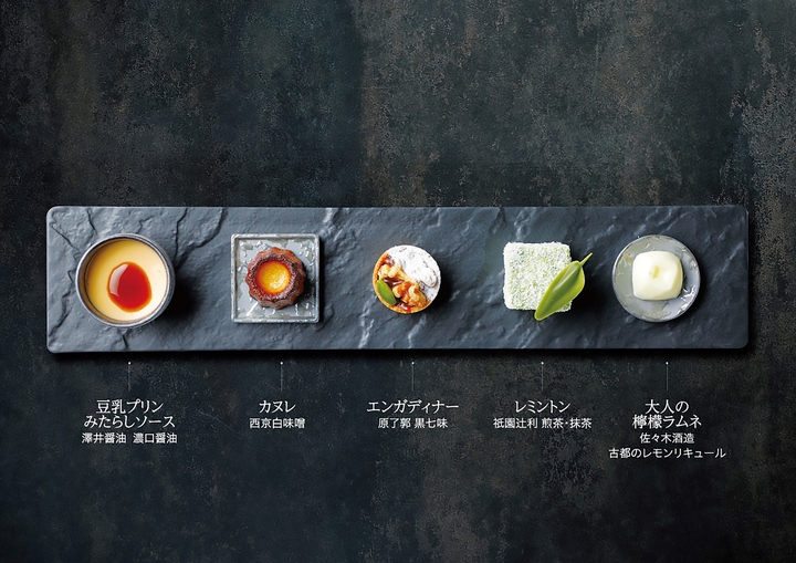 新登場の京プレートは、澤井醤油の濃口醤油を使った「豆乳プリン みたらしソース」や佐々木酒造のリキュールで作る「大人の檸檬ラムネ」、西京白味噌の「カヌレ」など、京都の老舗の調味料を使った、小さくて可愛いスイーツが並びます。調味料×スイーツの意外性が楽しめます。